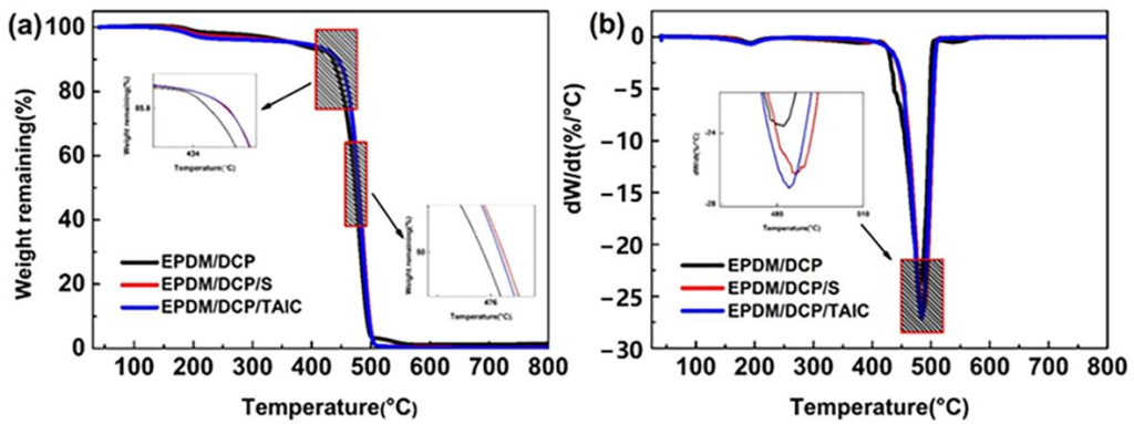 The thermogravimetric (TG) and differential thermogravimetric (DTG) curves of the pyrolysis reaction of EPDM rubber are shown in Figures 9a and 9b. Compared with EPDM/DCP, Ti, EPDM/DCP/S, and EPDM/DCP/TAIC, both the Tp and Tr of EPDM/DCP/S and EPDM/DCP/TAIC significantly increase, but their contents increase significantly, and the carbonization yields of EPDM/DCP/S and EPDM/DCP/TAIC slightly decrease. This shows that EPDM/DCP/S and EPDM/DCP/TAIC have higher thermal stability than EPDM/DCP. This can be attributed to the combined effect of S and TAIC, which increases the crosslinking degree of EPDM rubber, thereby enhancing its thermal performance and stability.