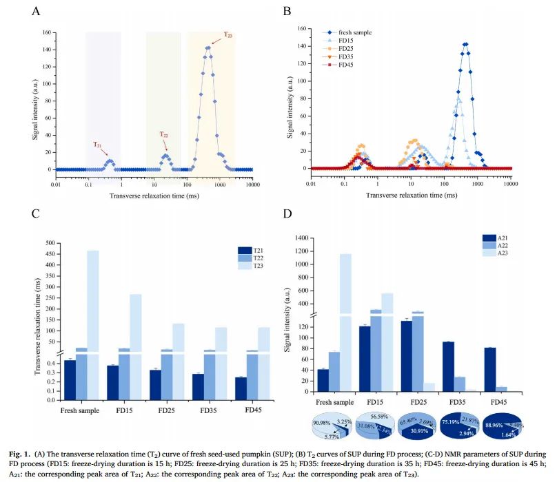 Figure 1. (A) Transverse relaxation time (T2) curve of fresh seed pumpkin (SUP); (B) T2 curve of pumpkin during the freeze-drying process; (C-D) NMR parameters of pumpkin during freeze-drying (FD15: freeze-drying time of 15 hours; FD25: freeze-drying duration of 25 hours; FD35: freeze-drying duration of 35 hours; FD45: freeze-drying duration of 45 hours; A21: peak area corresponding to T21; A22: peak area corresponding to T22; A23: peak area corresponding to T23)