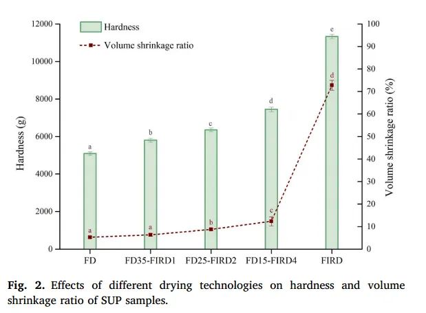 Figure 2. Effect of different drying techniques on the hardness and volume shrinkage rate of SUP samples