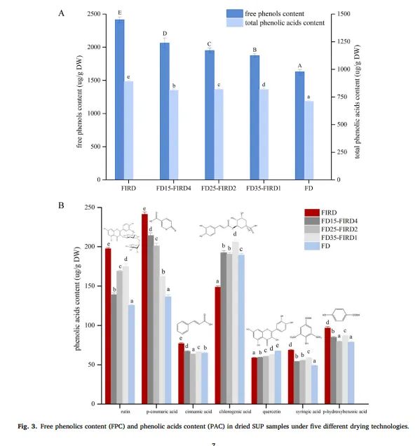 Seven phenolic acids were identified in the FD, FIRD, and FD-FIRD products: coumaric acid, chlorogenic acid, p-hydroxybenzoic acid, rutin, ferulic acid, cinnamic acid, and quercetin (Figure 3B). Coumaric acid was the most prominent phenolic acid detected in all dried SUP samples, with the highest content in FIRD samples (241.50 ± 0.88 μg/g DW). Notably, the coumaric acid content appeared to correlate positively with the FIR exposure time: FD15-FIRD4 (4 hours) had 214.27 ± 0.45 μg/g DW, and FD35-FIRD1 (1 hour) had 162.28 ± 0.43 μg/g DW. One reason is that FIR can induce ester bond cleavage between coumaric acid and hemicellulose. Another reason is that coumaric acid has good thermal stability. Additionally, FD35-FIRD1 had the highest chlorogenic acid content (206.13 ± 3.61 μg/g DW), which is related to the reduction in oxidation reactions caused by oxygen during the defatting process. According to previous studies, due to the presence of easily oxidized and unstable ester bonds and unsaturated double bonds, high drying temperatures and oxygen-rich environments may induce the isomerization of chlorogenic acid. Meanwhile, quercetin content in FD samples was 1.14 times higher than that in FIRD samples. Interestingly, the rutin content in FD15-FIRD4 was significantly reduced by 72% compared to FIRD samples, followed by FD25-FIRD2 (61%) and FD35-FIRD1 (55%). This change in rutin content may be due to the residual water content at the end of the defatting process. Ranieri et al. (2019) also found that the residual water content at the end of the dehydration process affects the changes in rutin content during the subsequent drying process, with higher residual moisture leading to rutin loss. As mentioned above, the phenolic acid content was influenced by different drying techniques, which could be due to changes in the interactions between phenolic acids and other compounds (such as pectin, cellulose, and proteins) or changes in the structure of phenolic acids. Furthermore, FD-FIRD is a viable alternative method for preserving phenolic compounds in SUP, and it may even outperform FIRD.