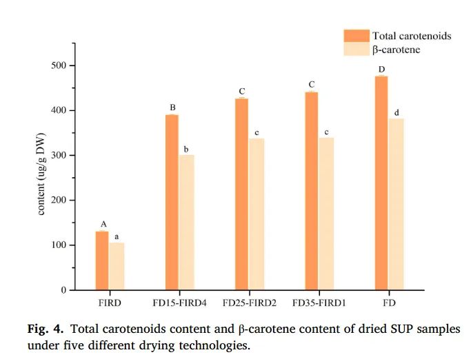 Figure 4. Total carotenoid content and β-carotene content of dried SUP samples under five different drying techniques