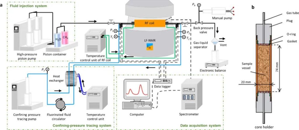 The materials used in this study include sodium montmorillonite, quartz sand, and CH4 gas. The equipment used to monitor the production and decomposition of gas hydrate is a low-field nuclear magnetic resonance device, manufactured by Suzhou Newmai Analytical Instruments Co., Ltd., Model: MacroMR02-100H-I.