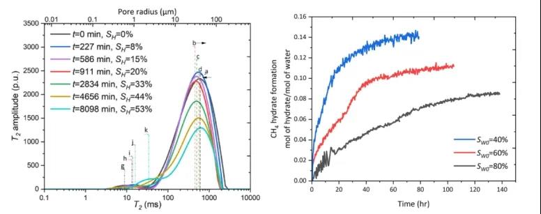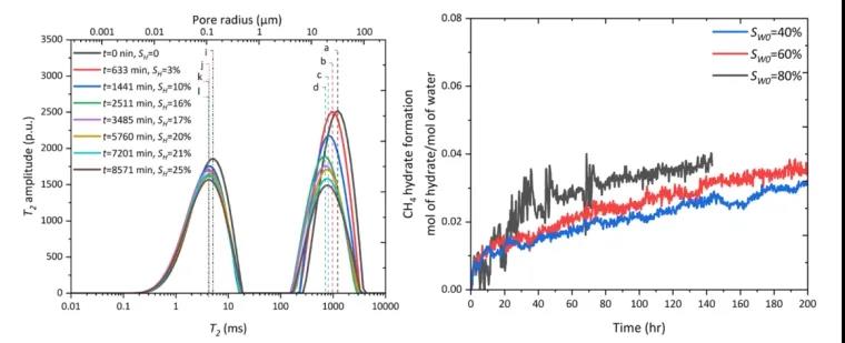 Figure 5 illustrates the shift of the T2 spectrum in the mud-rich sandy medium, first shifting left and then right. This indicates that the hydrate first forms in relatively large pores, then in smaller pores.