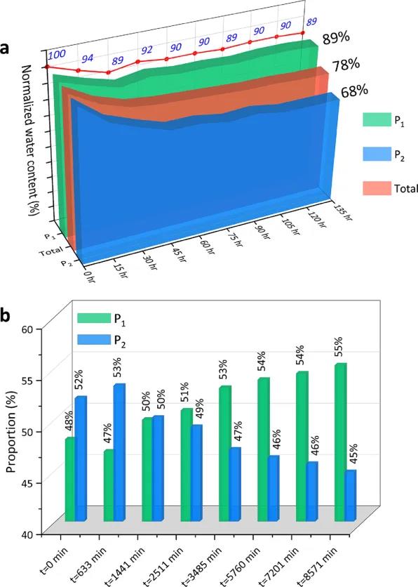 Figure 6 Evolution of CH4 Hydrate Formation Process in Mud-Rich Sandy Medium: (a) Evolution of Residual Water Content (Clay-Bound Water P1 and Pore Water P2); (b) Evolution of Residual Water Relative Content