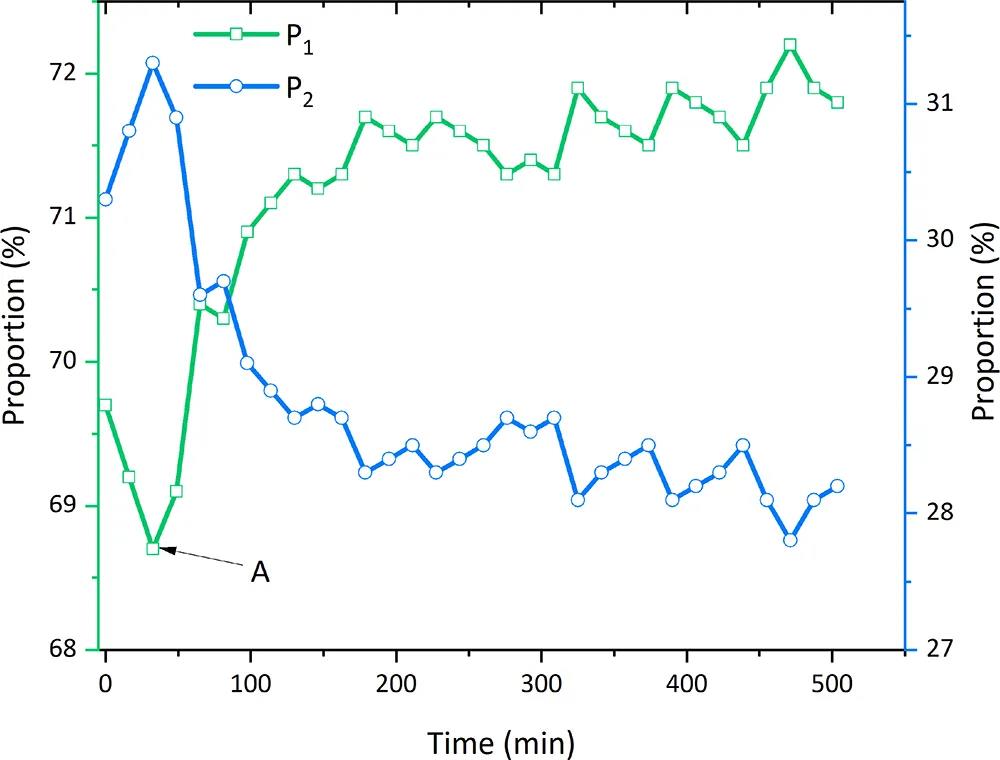 Figure 8 shows that CH4 hydrate initially decomposes in large sandy pores, causing a rapid increase in P2 signal. Subsequently, it decomposes in clay small pores. After tA = 33 minutes, the produced water from large sandy pores gradually transforms into clay-bound water, accompanied by a decrease in free water (P2) signal and an increase in clay-bound water (P1) signal.