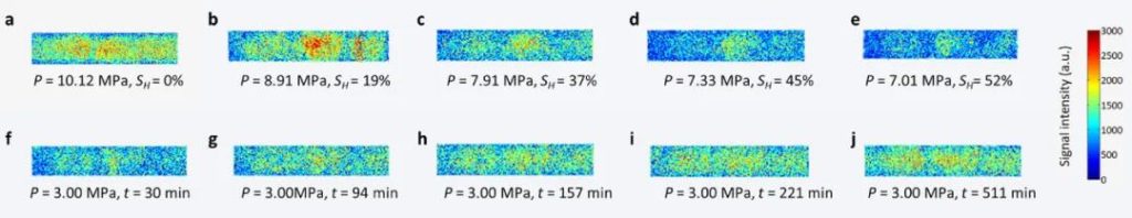 Figure 9 provides MRI images (using HSE sequence) of the CH4 hydrate formation and decomposition process in quartz sand at T = 2°C. The imaging information is related to the whole sample and is not sliced. Figures a to e represent hydrate formation, while figures f to j represent hydrate decomposition.