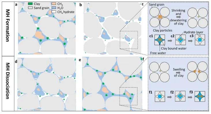 The study reveals the mechanism by which methane hydrate formation and decomposition, influenced by small-grained clay minerals, affects the pore structure and pore water migration in mud-rich sandy porous media. The results provide foundational experimental data and theoretical guidance for the subsequent safe and efficient extraction of mud-rich sandy natural gas hydrates.