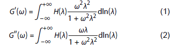 Arrhenius fitting of the shift factors confirmed that higher dynamic bond content hindered chain mobility, increasing activation energy—again aligning with FFC NMR results. The dynamic modulus master curve was further used to derive a relaxation time spectrum H(λ), shown below.