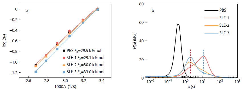 The SLE system clearly exhibited multiple relaxation modes. At lower PBS content, relaxation was dominated by PDMS segments (blue line, ~11.8 s). As PBS increased, dynamic bonding altered the relaxation profile, and short-time relaxations became dominant (red line, ~2.1 s).