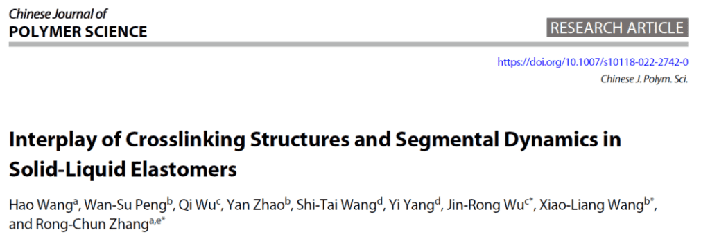 In this study, the authors combined rheological analysis and solid-state NMR to characterise a novel solid–liquid elastomer (SLE) crosslinked via dynamic boron–oxygen coordination bonds. They explored the macroscopic viscoelasticity and microscopic chain dynamics of the system and discussed how dynamic bond content influences network structure parameters (e.g., uniformity, molecular weight between crosslinks) and chain mobility at various timescales (e.g., Rouse motion, reptation).