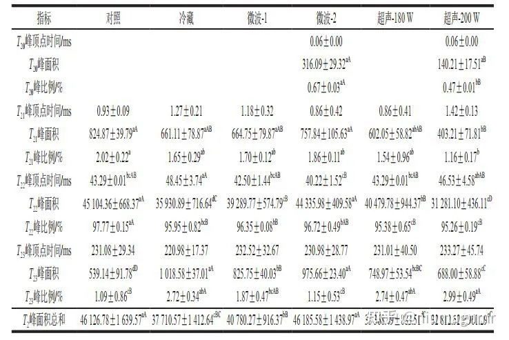 Thawing methods significantly affected the T22 peak time and proportion (P < 0.05). Compared with the control, refrigeration and 200 W ultrasound thawing notably extended T22 peak times (P < 0.05) and shifted peaks to the right. Although no significant differences were found in peak time among the other three methods, microwave-thawed samples showed a trend of leftward peak shift.