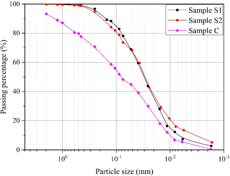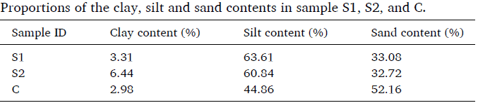 It is generally believed that clay content is an important factor influencing the water-soil system. Therefore, the effect of clay content on unfrozen water content during soil freezing must be considered. First, the clay content in the soil samples needs to be determined. Different countries and regions use different classification methods. In this study, the USDA/FAO system was used. As shown in the table below, S1 and S2 have relatively high clay and silt content, while C has a higher sand content and lower clay and silt content. The clay content of S1, S2, and C is 3.31%, 6.44%, and 2.98%, respectively.