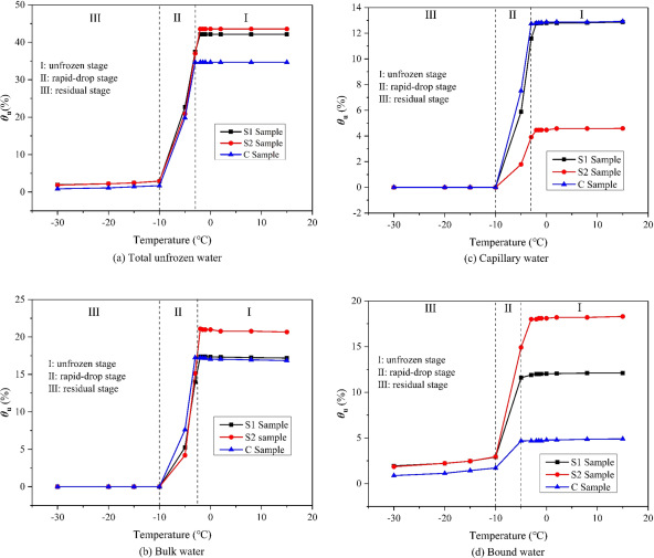 In the first stage, the unfrozen water content remains constant; when the temperature falls below a certain negative value, the content of all three types of unfrozen water decreases rapidly; when the temperature in the third stage is lower than -10°C, the unfrozen water content in the soil stabilizes, with free water and capillary water reaching zero, and only bound water remains, which is called the residual stage.