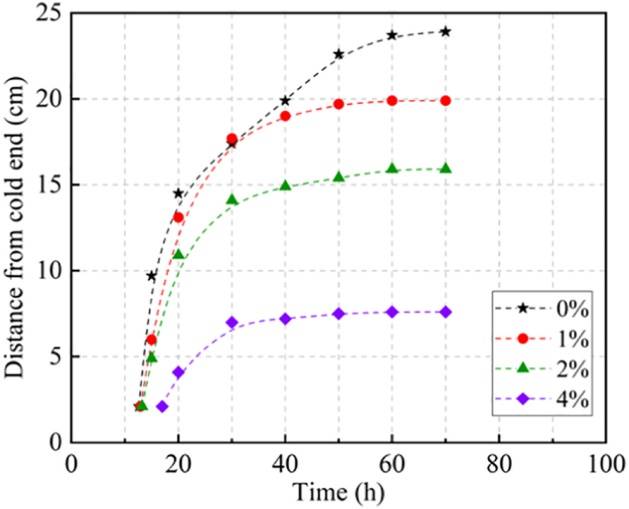 Previous studies have shown that during unidirectional freezing, the temperature distribution is linear near the cold end, but exhibits nonlinear behavior near the unsteady warm end. Therefore, the position of the unsteady freezing front is also determined through linear interpolation, as it is closer to the cold end during the early freezing stages. Figure 4 illustrates the evolution of the freezing front’s position, with its distance from the cold end changing over time. The freezing front moved quickly at the start of freezing and gradually reached thermal equilibrium by the end of the process. In the rapid-moving phase, the freezing front in samples with higher salt content moved slower than those with lower salt content due to the depression of the freezing point caused by the salt. In the stable phase, the final position of the freezing front depended on the salt content, with samples containing lower salt having the freezing front further from the cold end. Furthermore, salt migrated towards the cold end with the water, being excluded from the ice as the pore water froze. Therefore, salt concentration increased near the freezing front, further suppressing upward movement.