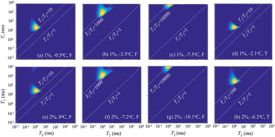 As shown in Figure 5, low-field NMR T1-T2 test results were obtained for samples with two different salt contents at four temperatures to illustrate the representative stages of the T1-T2 spectra during F-T, as well as the influence of temperature and salt content. Specifically, four temperatures were chosen, as shown in Figure 5. For each sample, a temperature below the freezing point was selected (e.g., -3.5°C for 1% salt and -7.2°C for 2% salt) to analyze the effects of temperature and salt content on water molecule mobility. The T1/T2 ratio is a characteristic parameter indicating molecular mobility.