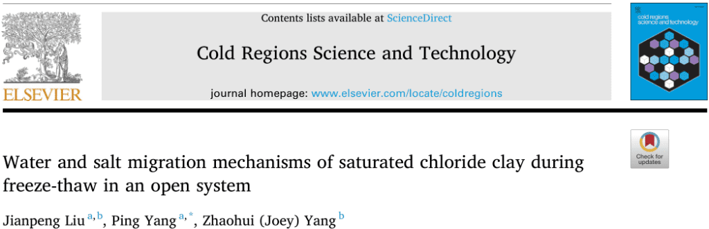 [1] Liu J, Yang P, Yang Z J. Water and salt migration mechanisms of saturated chloride clay during freeze-thaw in an open system. Cold Regions Science and Technology, 2021, 186(8):103277.