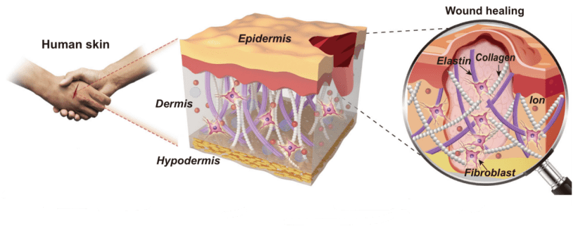 These two phases not only heal with the help of dermal fibroblasts on the wound but also give human skin high fracture toughness by fixing crack tips on the nanofibers. As a result, human skin can withstand certain tears and repeated deformations, enduring over one million cycles annually without fatigue.