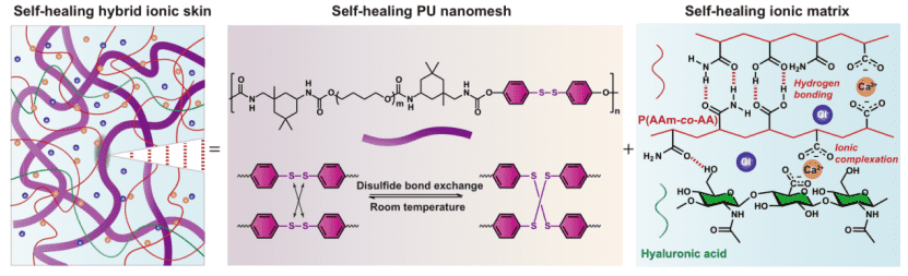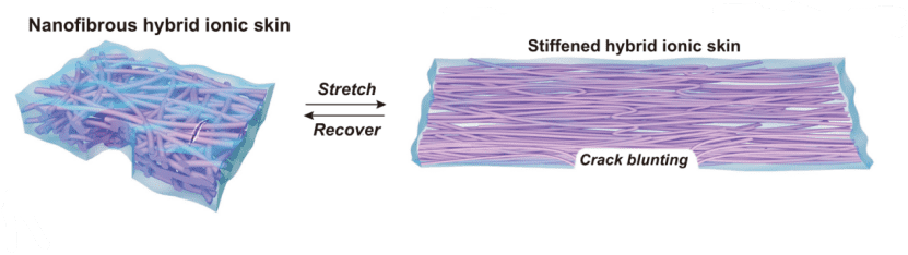 Balancing self-healing and fatigue resistance is a challenging task for stretchable nano-materials for ionic skin (human skin analogs). Notably, most self-healing ionic skins are generated by introducing dynamic covalent or physical cross-linking into the ionic conductive network. This dynamic inter-chain design generally does not contribute to fatigue fracture resistance, as the low energy of the polymer chains makes them susceptible to crack propagation under repeated loading.