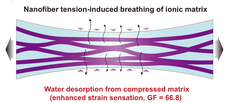 The tension-induced alignment of the nanofibers forces the hygroscopic ionic matrix to reversibly absorb moisture from the air, significantly enhancing the stretchability.