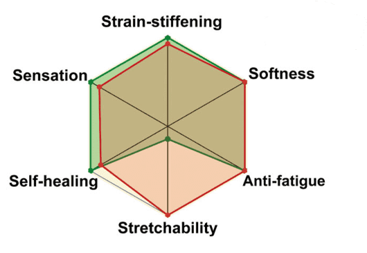 Related reports introduced swollen covalent network microspheres to reversibly entangle with linear networks, achieving both high fatigue resistance and self-healing. However, the resulting mechanical strength is relatively low due to the embedded intrinsic softness. In contrast, human skin effectively balances self-healing and fatigue resistance, thanks to its ion-rich and layered nanofiber-repairable structure, supported by a soft elastic matrix.