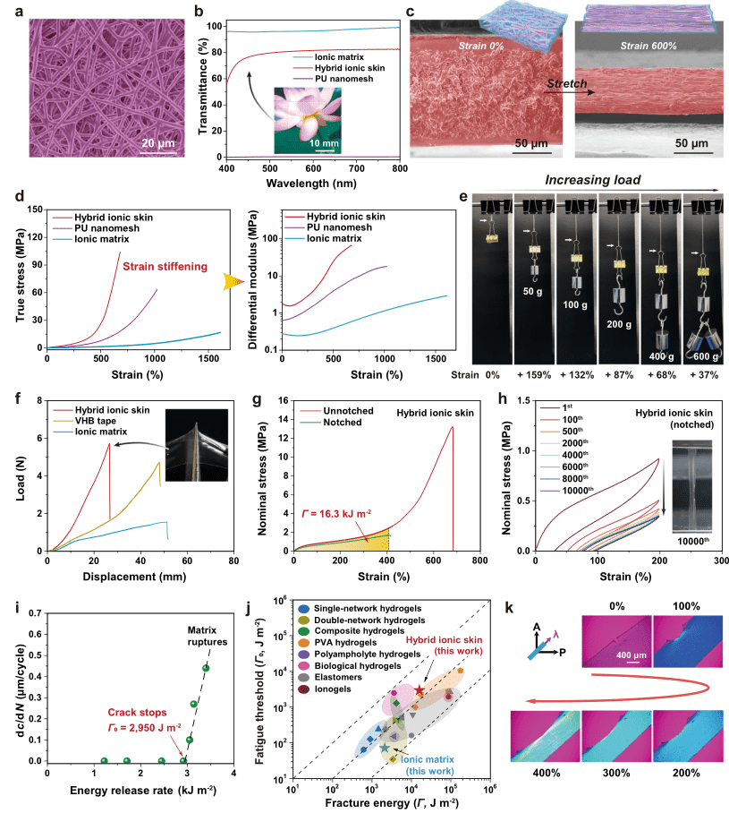 Fig. 6c shows the cross-sectional electron microscope images of the artificial ionic skin before and after stretching, where the pre-stretching artificial ionic skin exhibits a sandwich-like structure, with a mesh structure in the middle and two thin layers of ionic matrix on the outside. After stretching, the three layers deform cooperatively without inter-layer delamination or fiber pull-out;