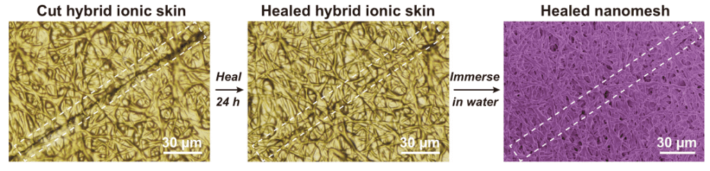 Here, we vividly demonstrate one of the most important characteristics of artificial ionic skin—its self-healing ability, similar to human skin.