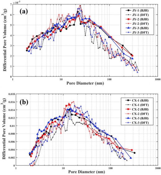 According to the LTGA results, most of the shale pores range from 5 to 200 nm, with the CX series samples containing more micropores than the JY series samples. Although the BJH model and the DFT model show generally consistent PSD results, subtle differences exist between them. The PSD curve generated by the DFT model displays multiple peaks, providing more detailed information than the BJH model.