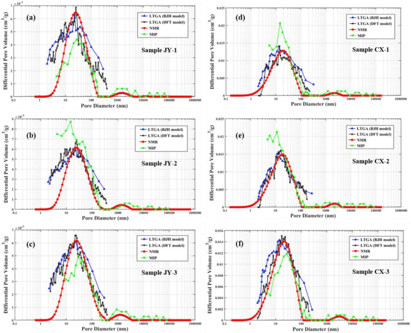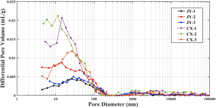 Compared with LTGA analysis, only half of the tested samples (JY-1, JY-3, and CX-3) showed acceptable results, while the other three samples (JY-2, CX-1, and CX-2) exhibited significantly larger pore volumes at pore sizes <300 nm compared to LTGA results. This phenomenon may be due to extreme mercury intrusion pressure causing distortion and damage to small pores.