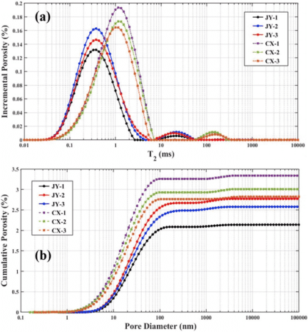 It can be seen that the T2 spectra of each series sample are similar. In other words, the impact of sample heterogeneity can be ignored in this study. By comparing the results from LTGA and MIP, the T2 spectra were converted to pore size distributions, and the relationship between cumulative porosity and pore diameter is plotted in the figure. When pore size <300 nm, cumulative porosity increases sharply; when pore size >1000 nm, cumulative porosity increases slightly, reflecting that nanopores are the main component of the pore structure. It was also found that CX series samples contain more micropores than JY series samples.