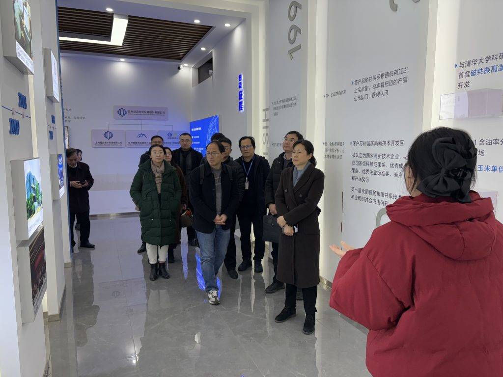 During the visit to New Mai’s exhibition hall, President Gu and his team gained an in-depth understanding of the development history of New Mai Analytical. Starting from the initial nuclear magnetic resonance prototype developed at East China Normal University, New Mai has made numerous innovative breakthroughs in low-field magnetic resonance technology, applications, and products, achieving significant market expansion and numerous successful collaborations with users.