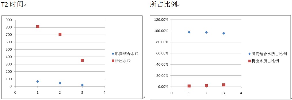 As shown, the expelled-water and muscle-bound-water peaks present at 3 h disappear by 4.5 h. Even the shortest expelled-water T2 exceeds the initial muscle-bound-water T2; yet beyond ~65 ms no peaks remain at 4.5 h. Once no further water is expelled, the muscle has lost water-holding capacity—its bound-water signature vanishes. From Stage 2 onward, the spectra no longer represent expelled water vs. muscle-bound water.